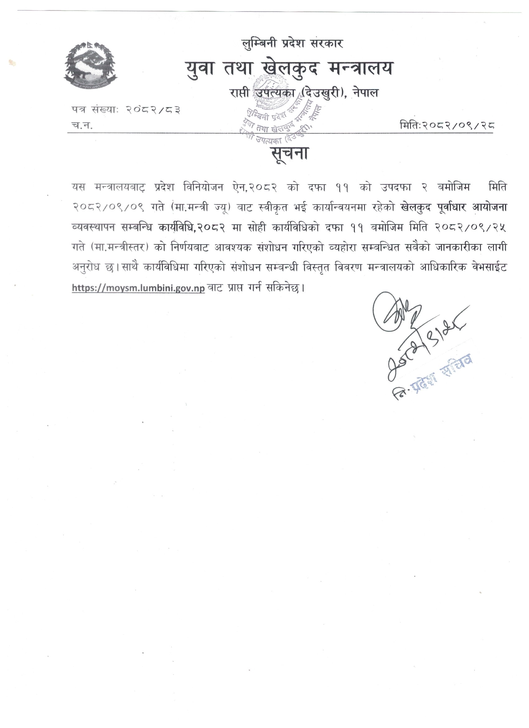 खेलकुद पूर्वाधार आयोजना व्यवस्थापन सम्बन्धी कार्यविधि २०८२ (पहिलो संशोधन ) सम्बन्धी सूचना